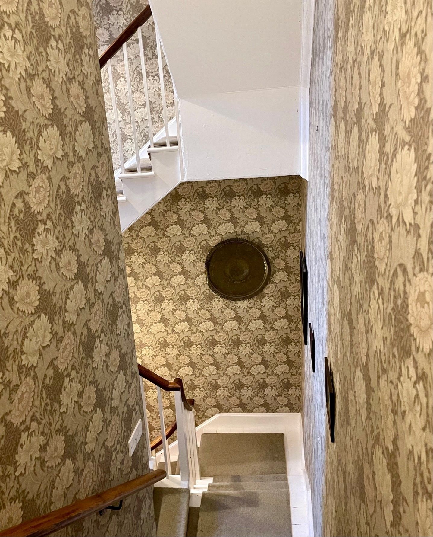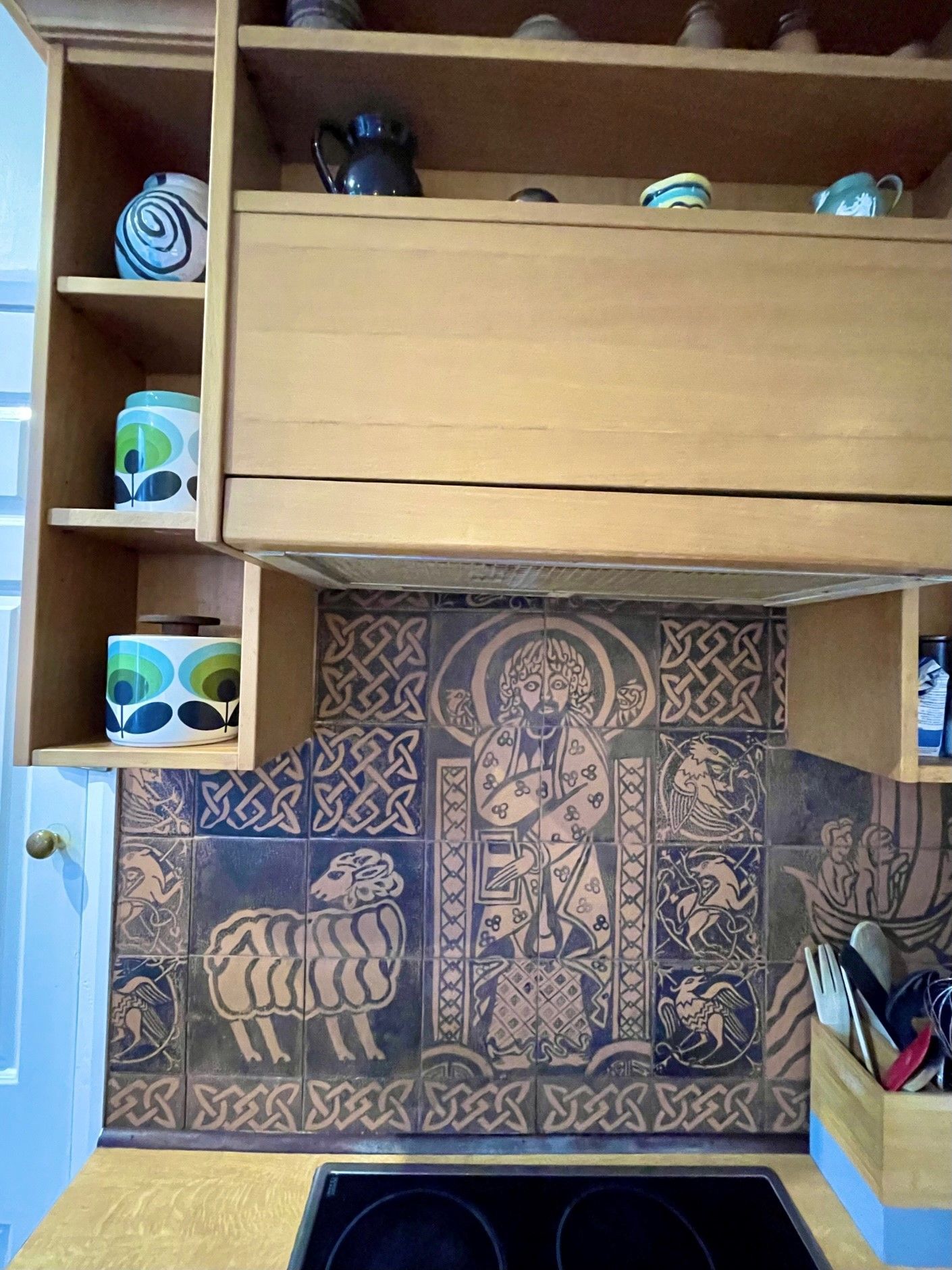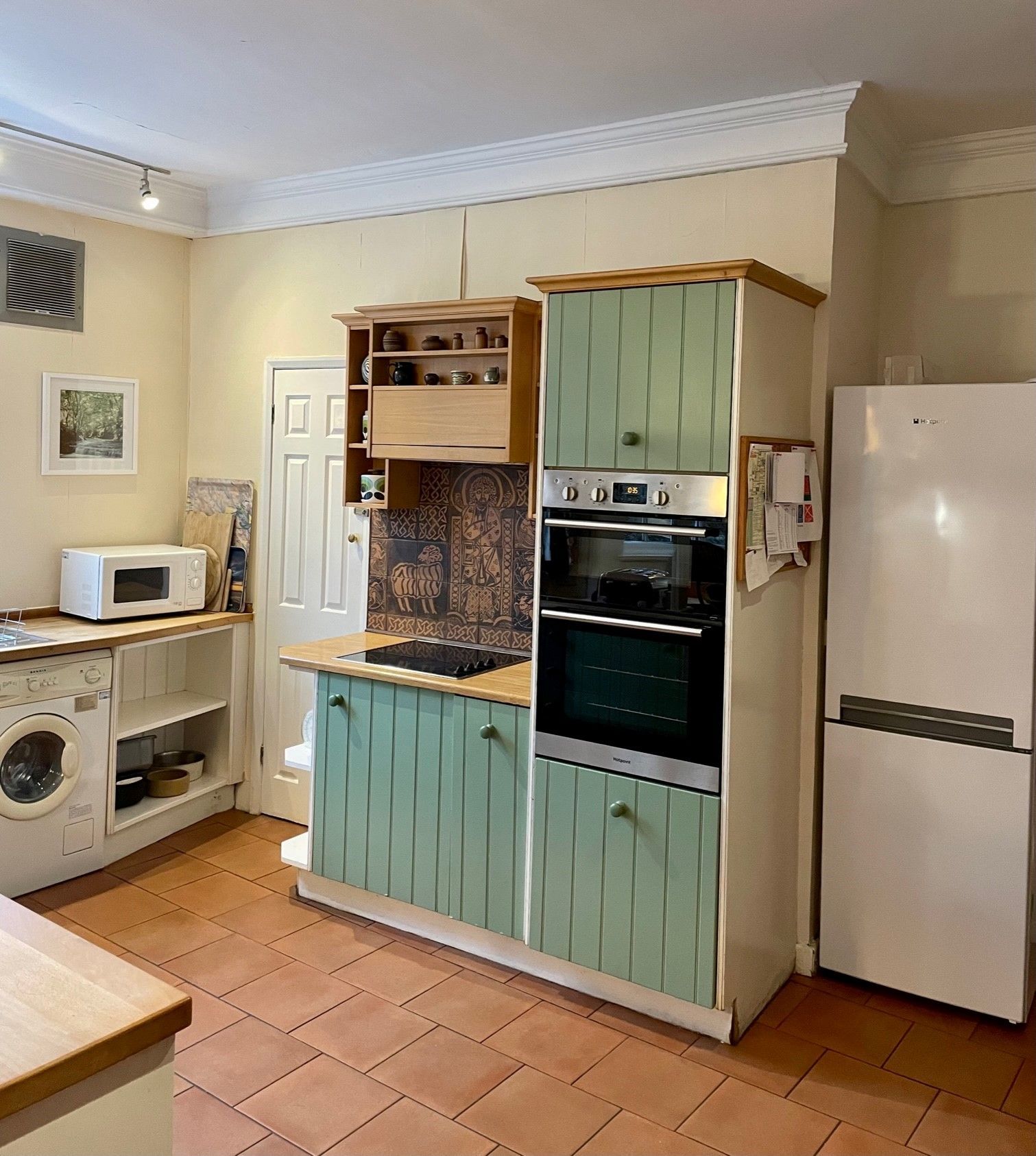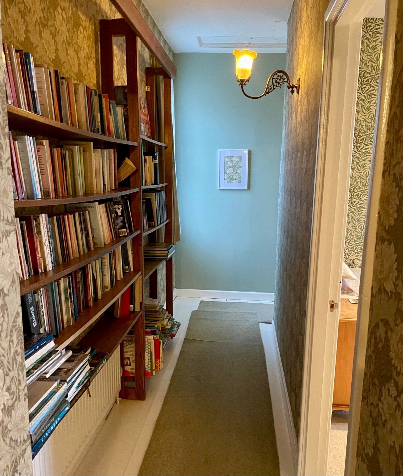 This elegant Georgian house features William Morris wallpaper and antique furniture, with scenes from the Lindisfarne Gospels on the fireplace proggy mat and the tiles over the hob. Links View has accommodation on three floors, with four bedrooms, a family bathroom, a toilet on each floor, and washbasins in the upper floor bedrooms.