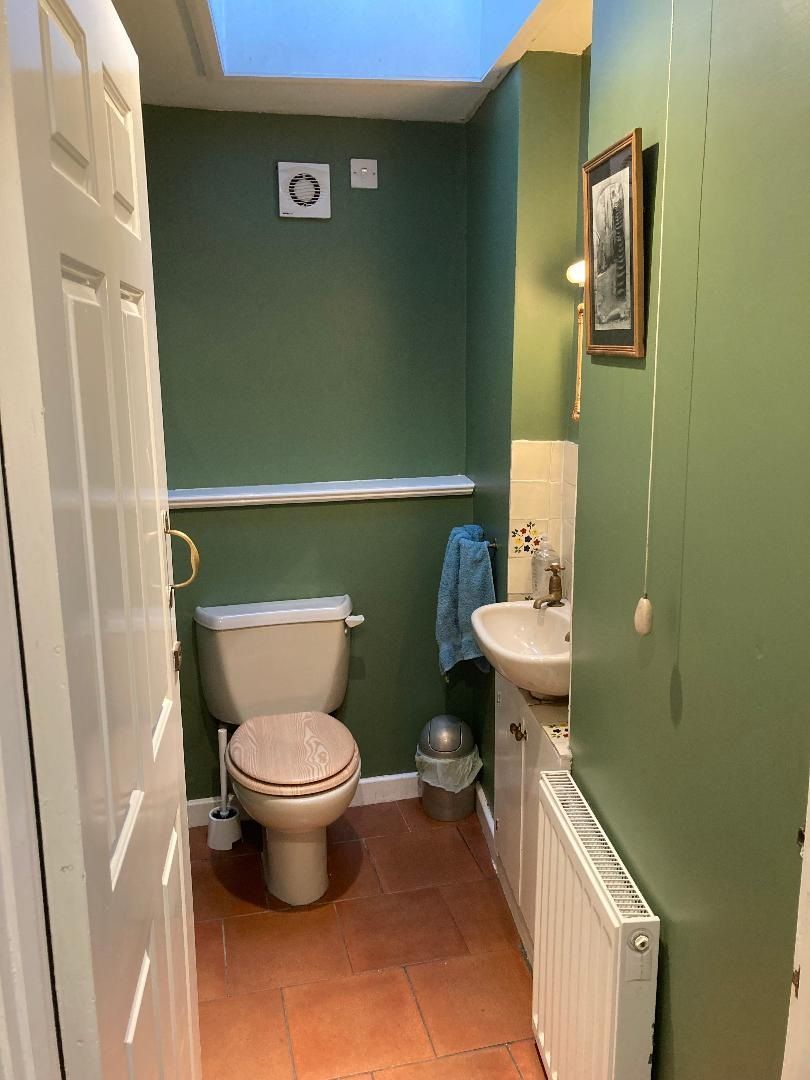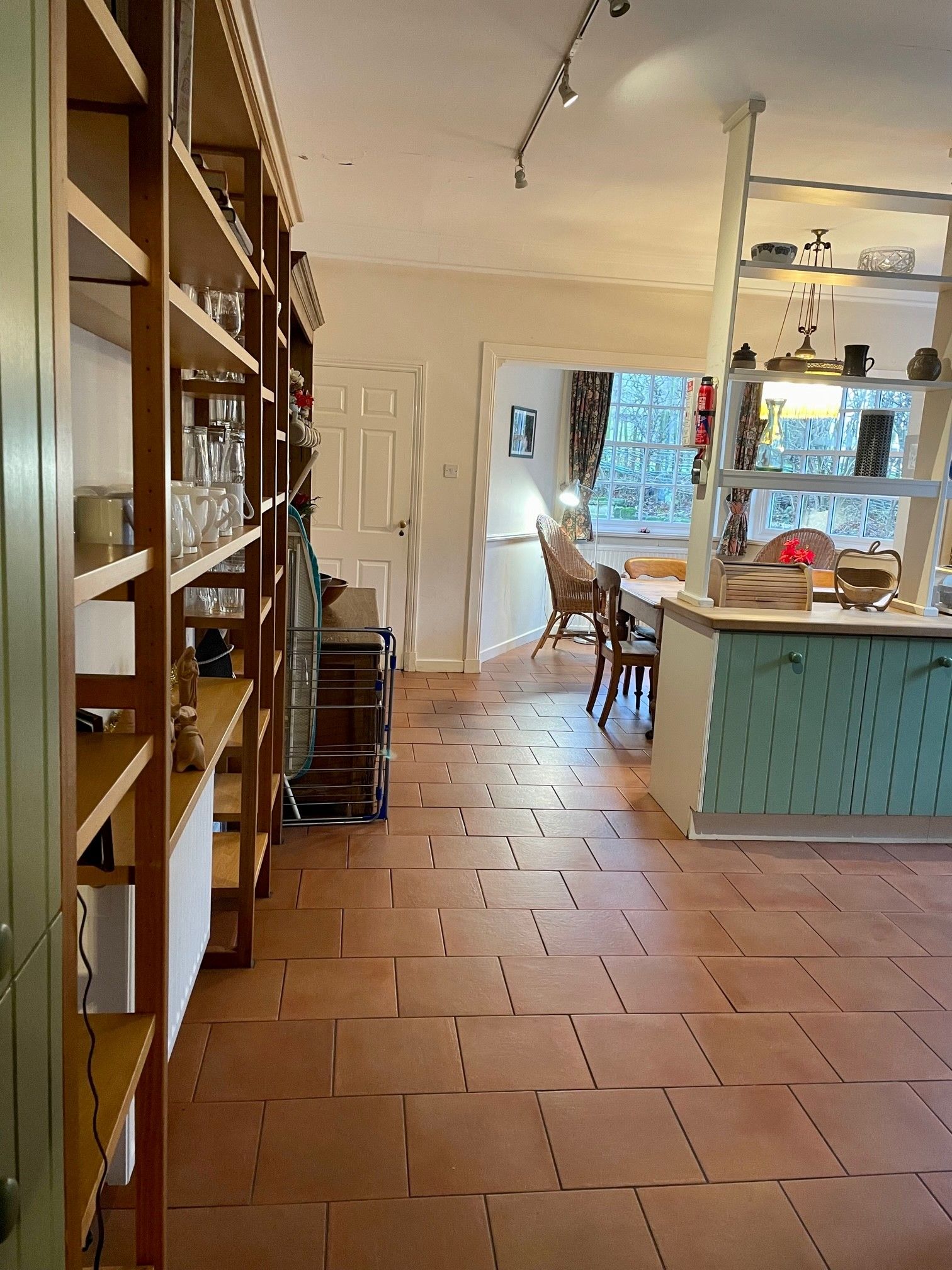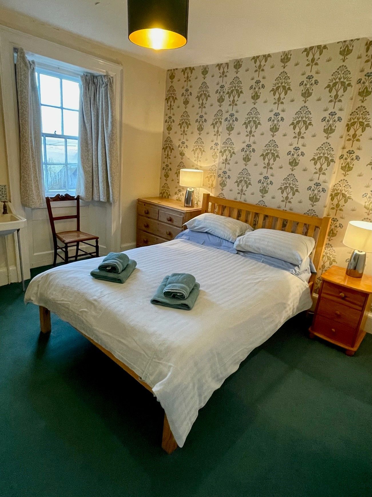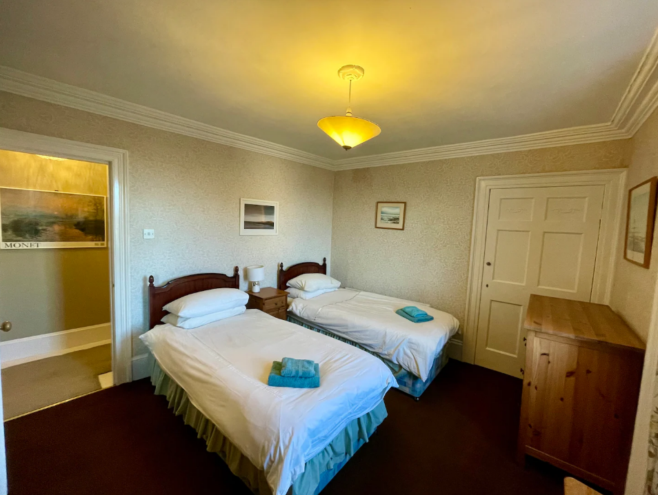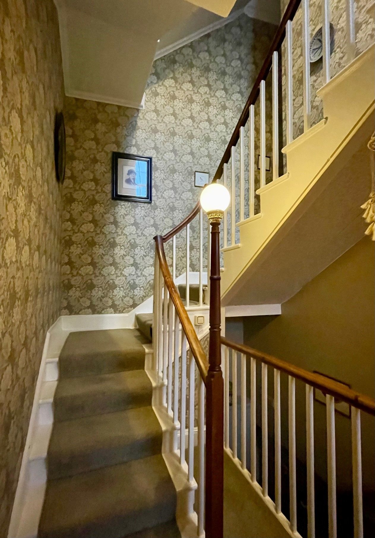 This elegant Georgian house features William Morris wallpaper and antique furniture, with scenes from the Lindisfarne Gospels on the fireplace proggy mat and the tiles over the hob. Links View has accommodation on three floors, with four bedrooms, a family bathroom, a toilet on each floor, and washbasins in the upper floor bedrooms.