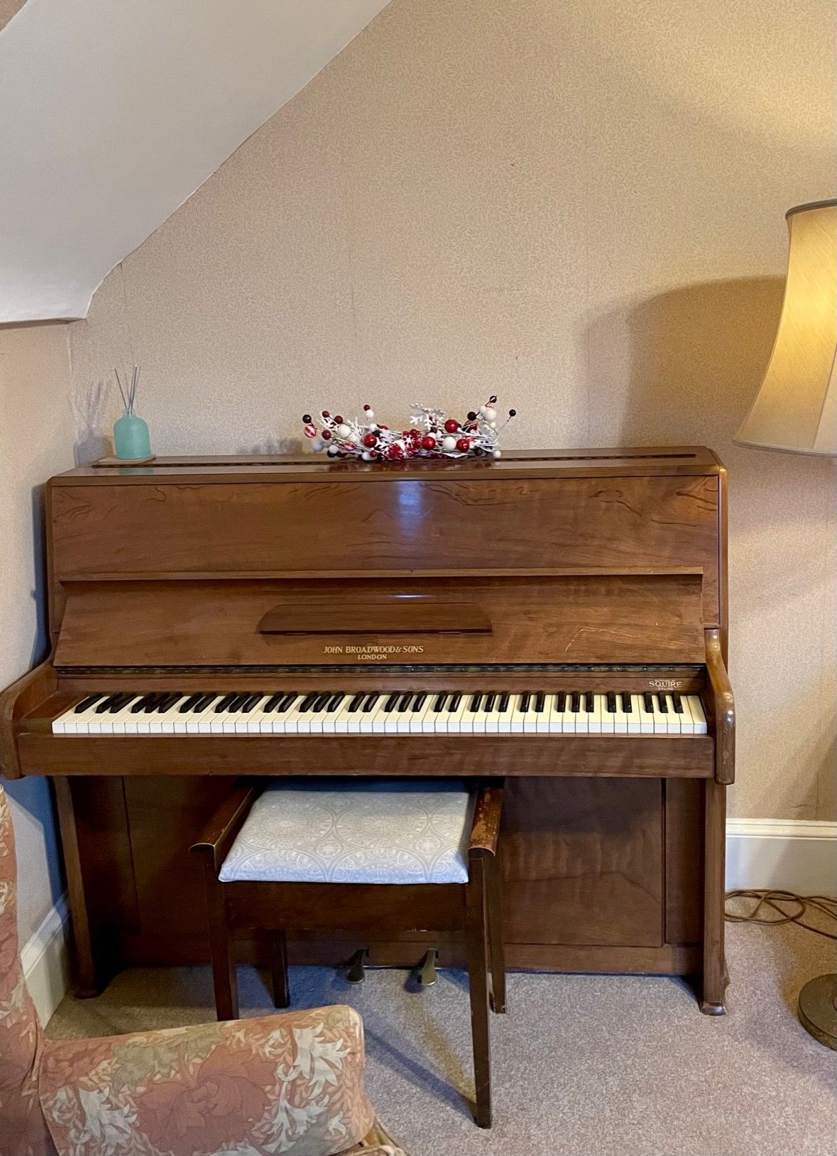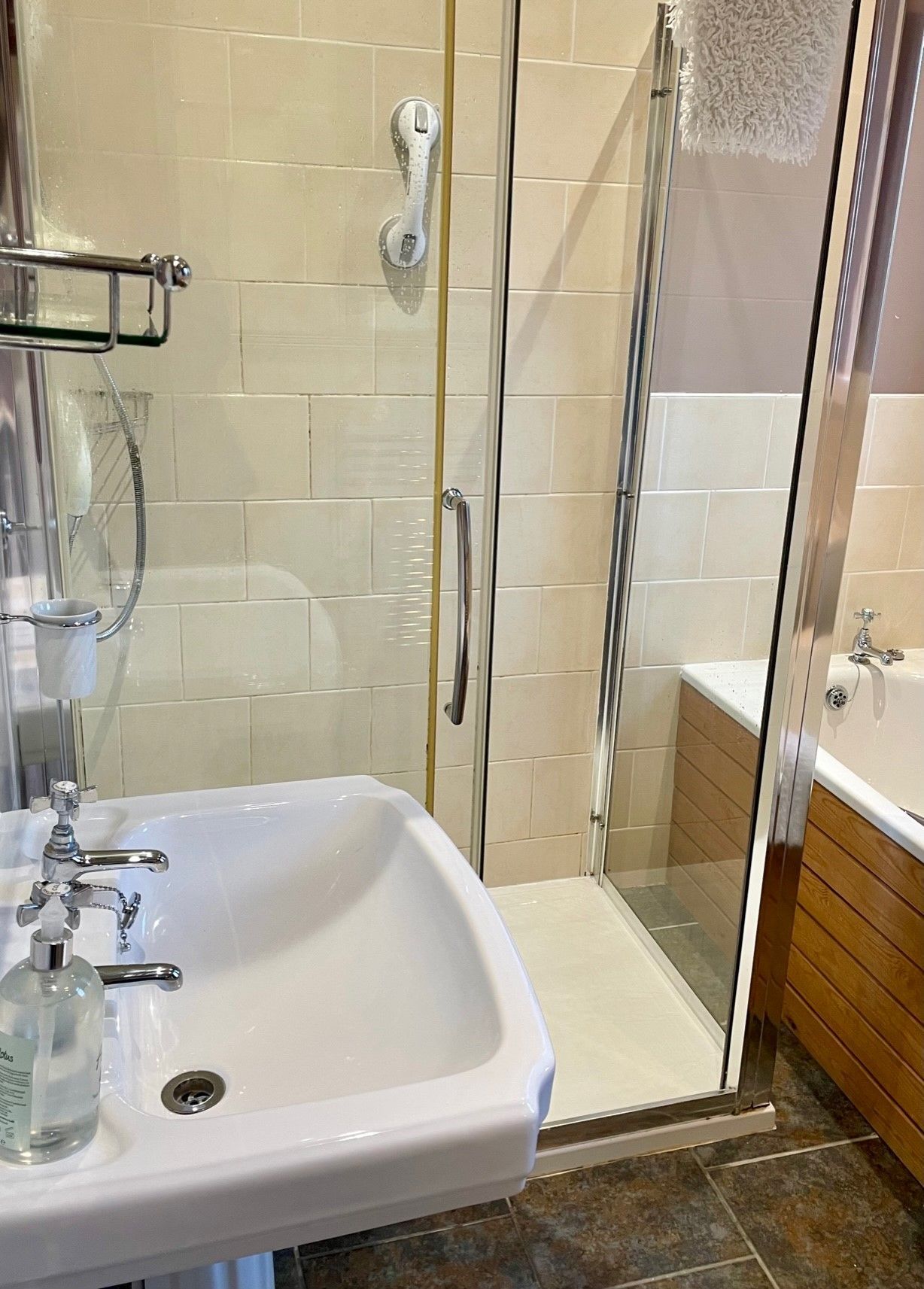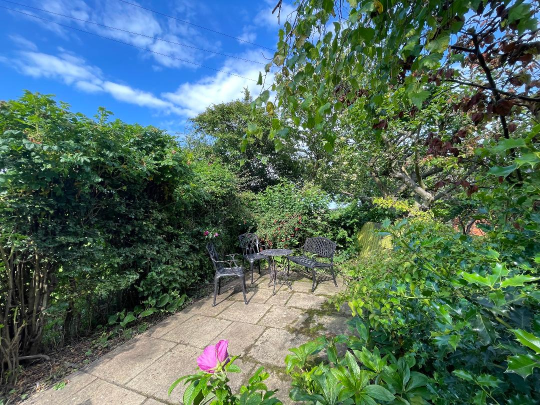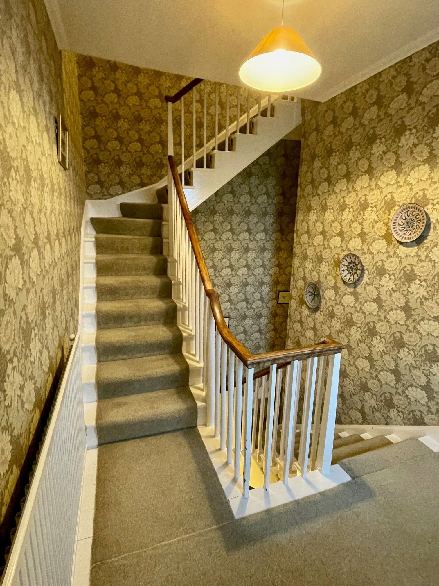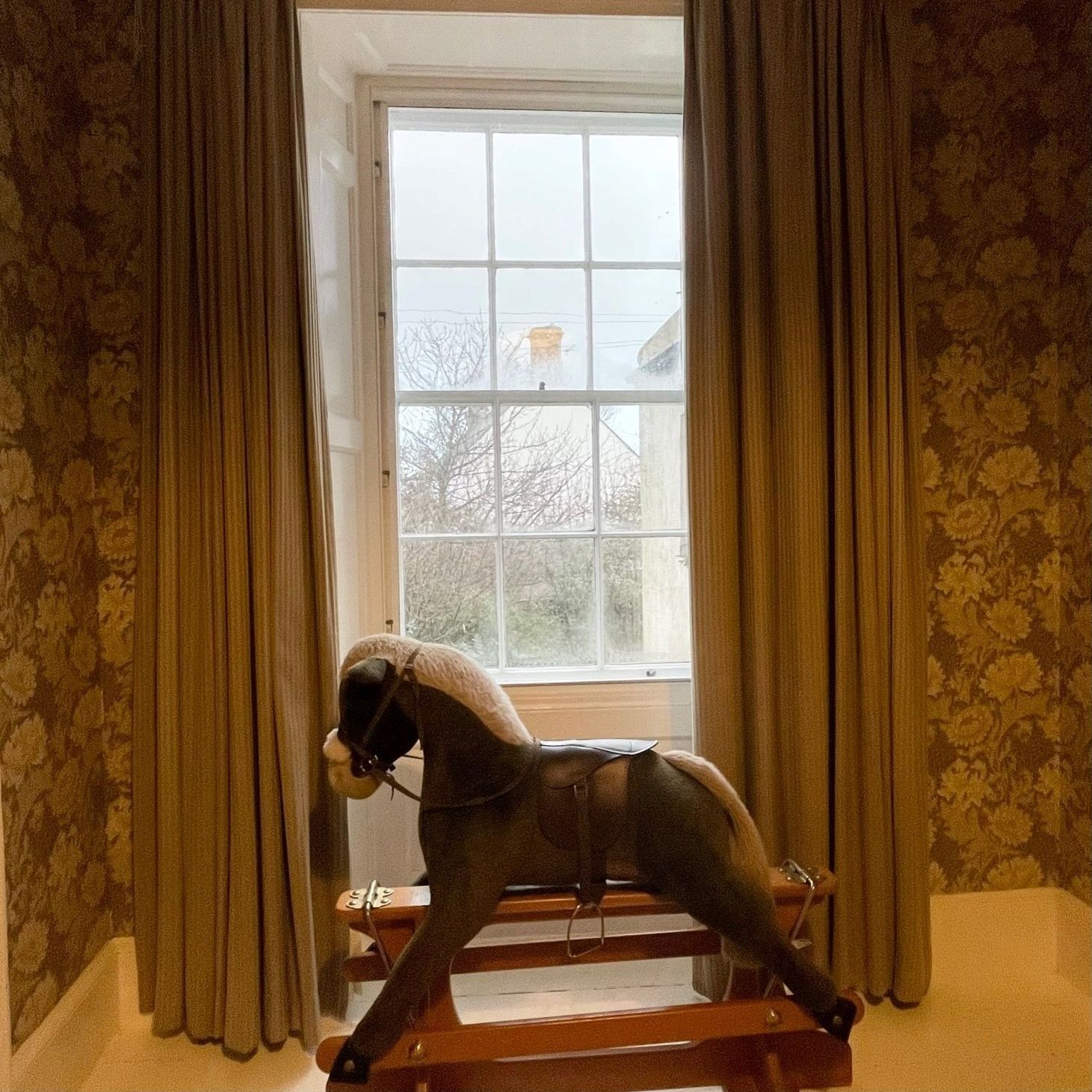 This elegant Georgian house features William Morris wallpaper and antique furniture, with scenes from the Lindisfarne Gospels on the fireplace proggy mat and the tiles over the hob. Links View has accommodation on three floors, with four bedrooms, a family bathroom, a toilet on each floor, and washbasins in the upper floor bedrooms.